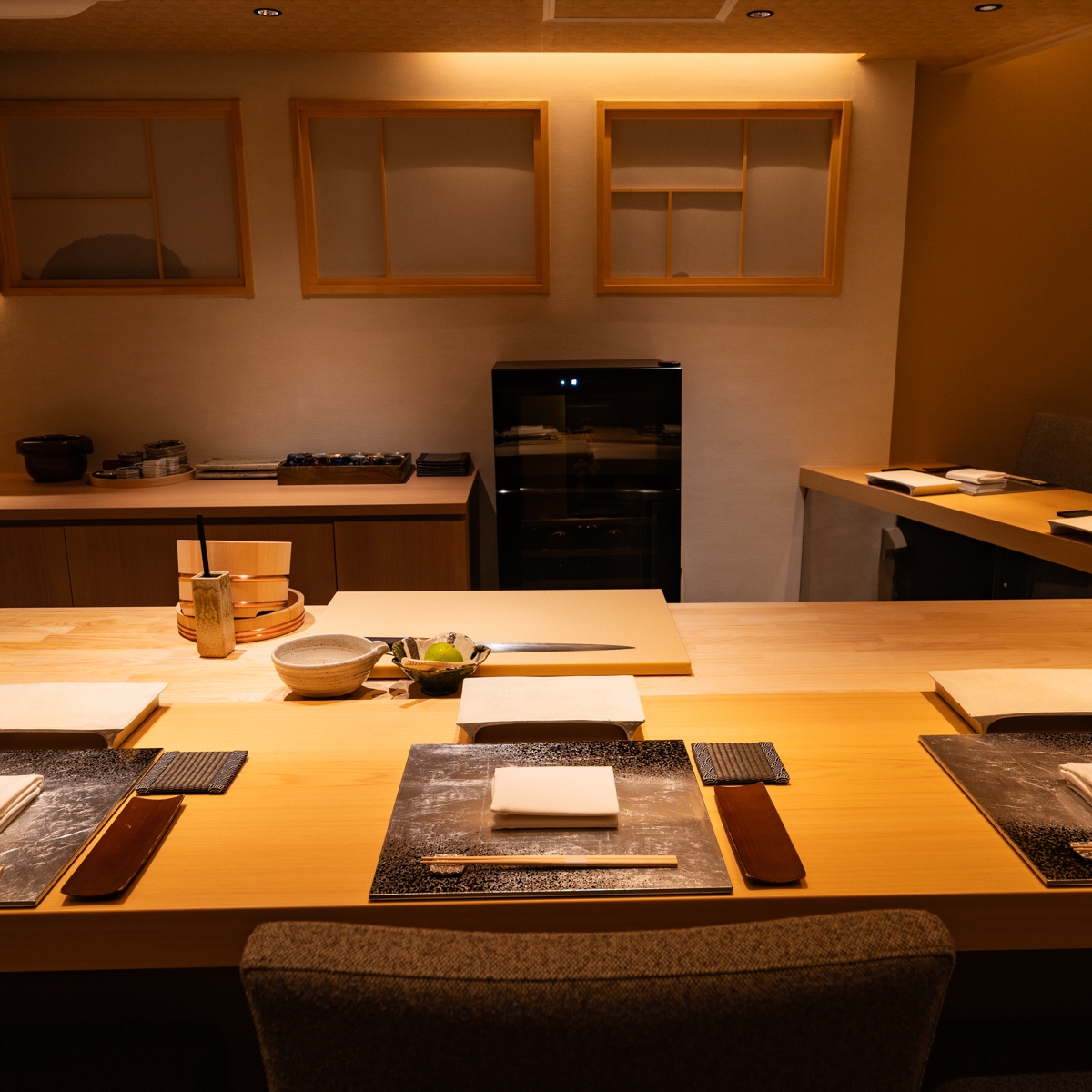 お席は、職人の所作を間近に感じられるカウンター8席のみ。作家ものの器や美しい盛り付けも、鮨とともにお楽しみください。